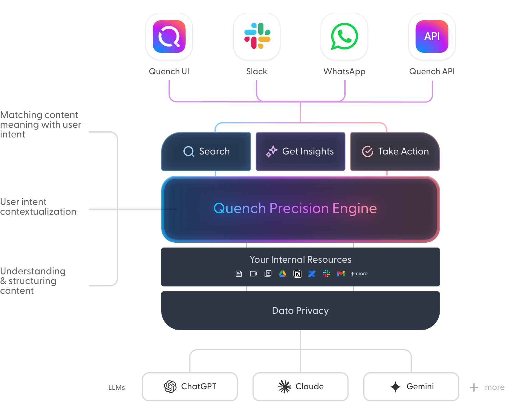 Quench uses federated search + retrieval-augmented generation (RAG) across your connected systems.